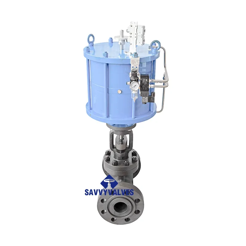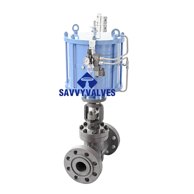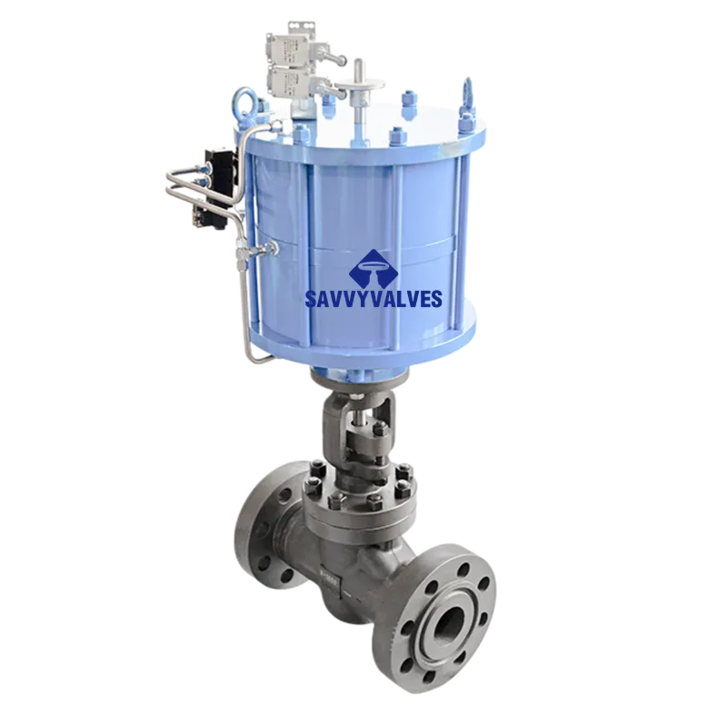 This high‑pressure pneumatic globe valve is driven by a piston‑type actuator, designed for Class 1500 service. The RTJ (Ring Type Joint) flanged ends ensure reliable sealing under extreme pressures using metal ring gaskets. The piston actuator delivers high output torque and fast response, making it ideal for remote automatic control or emergency shutdown applications in oil & gas, petrochemical, power generation, and refining industries.