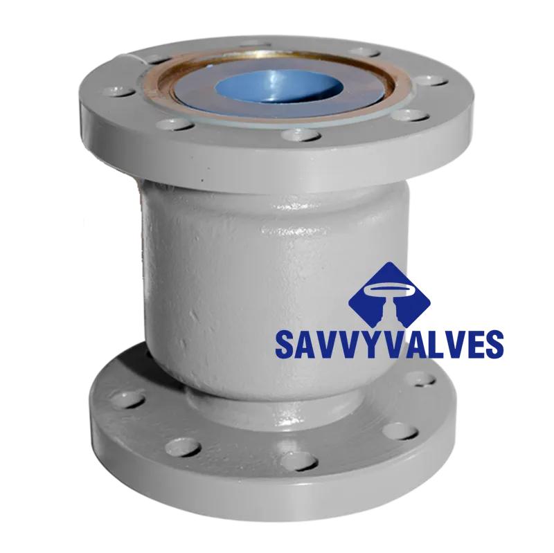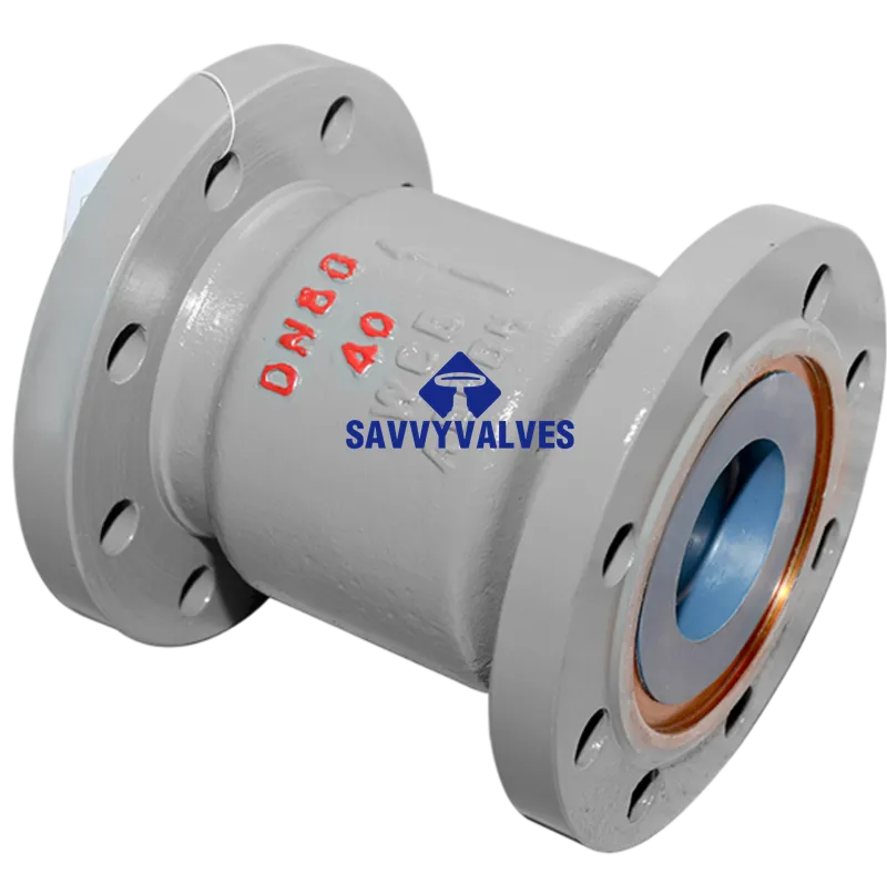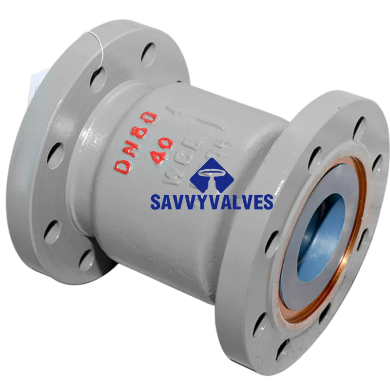 Construction | Axial flow – streamlined body, centre‑guided disc, spring‑assisted closure |